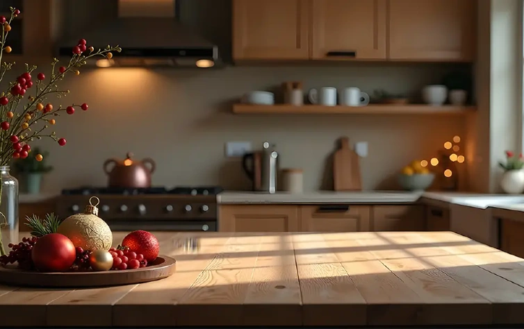 Itens que fazem parte da rotina podem assumir papel decorativo: uma caneca temática exposta, um pano de prato elegante, uma tábua de madeira com laço ou uma bandeja com talheres especiais. Esses elementos ocupam o espaço que você já usa, mas trazem uma leitura festiva ao ambiente.